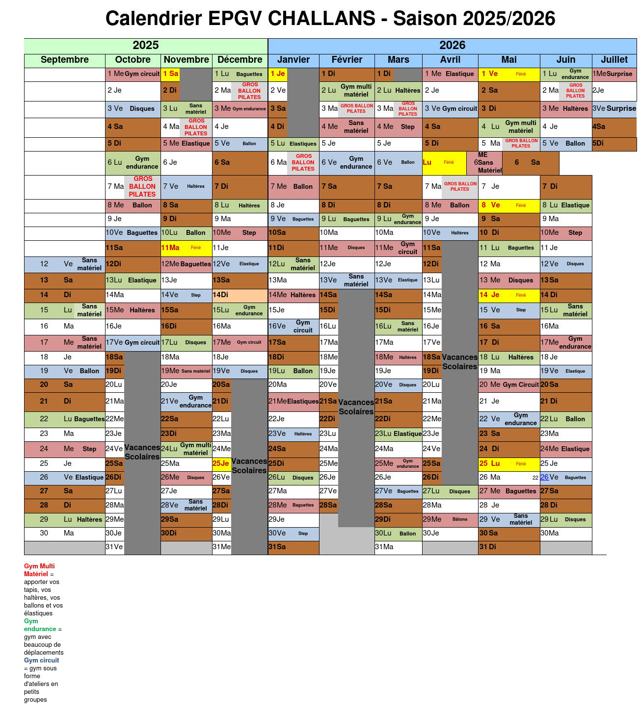 Calendrier du matériel par séance ( uniquement pour les cours de gym dynamiques et Pilates mardi)